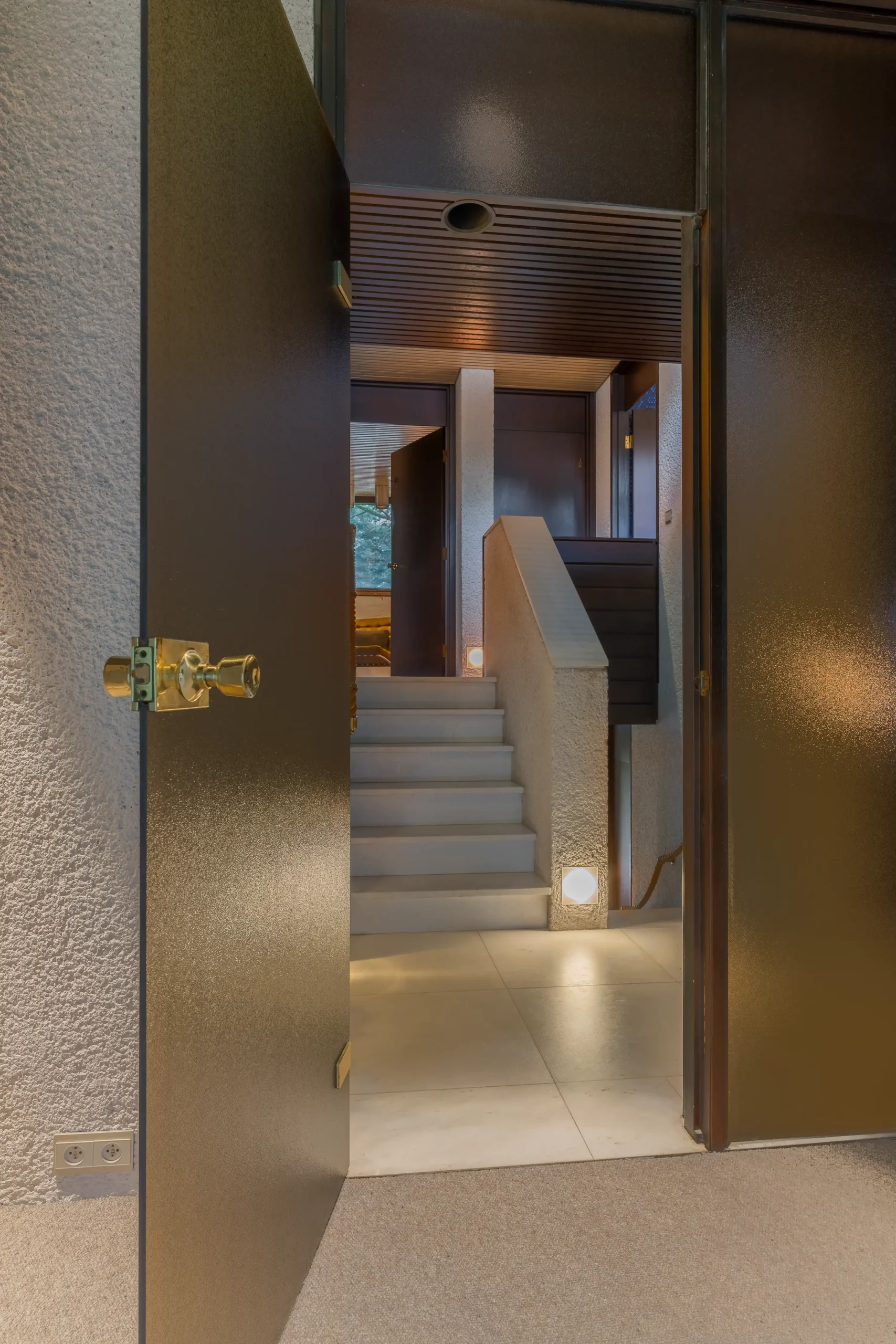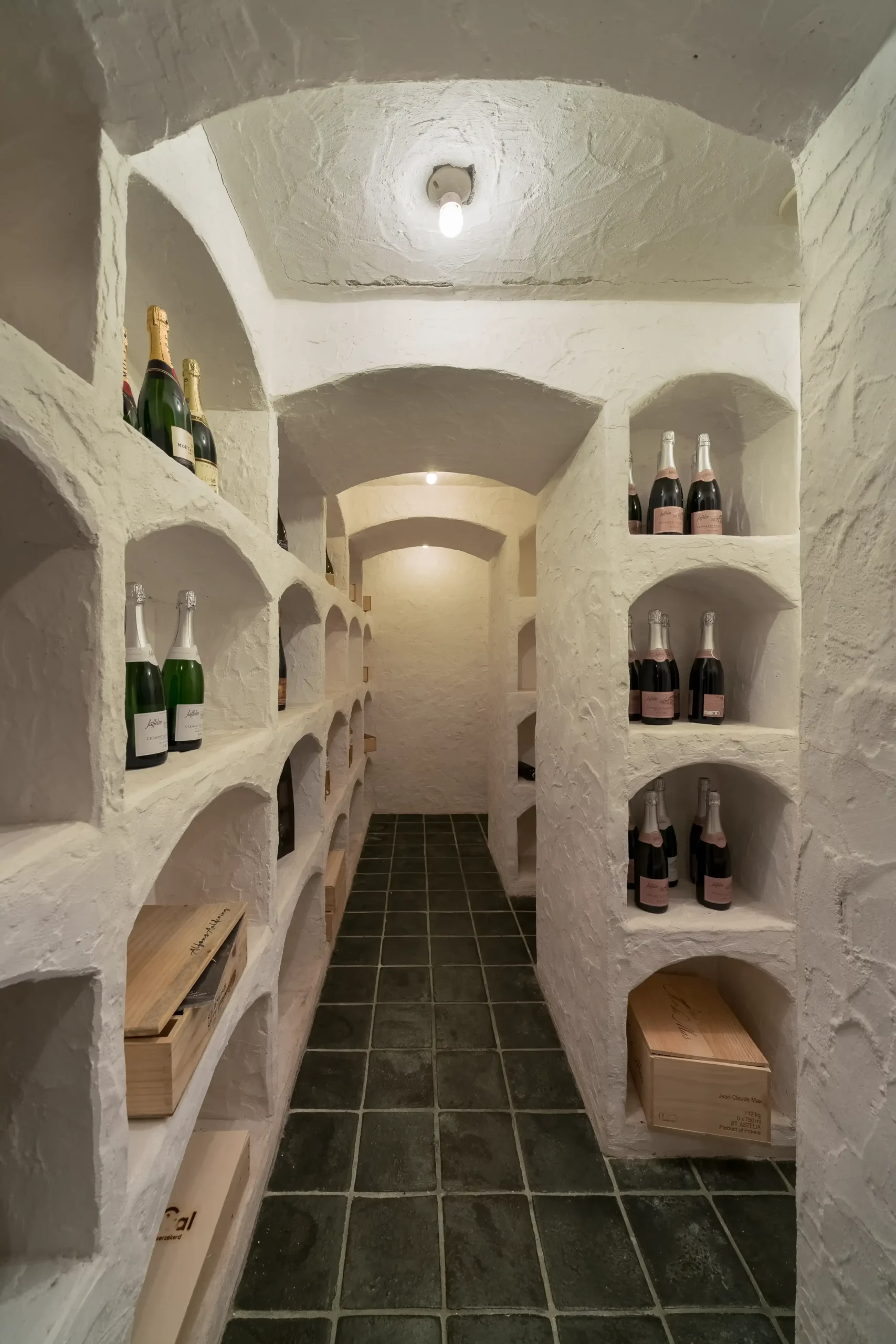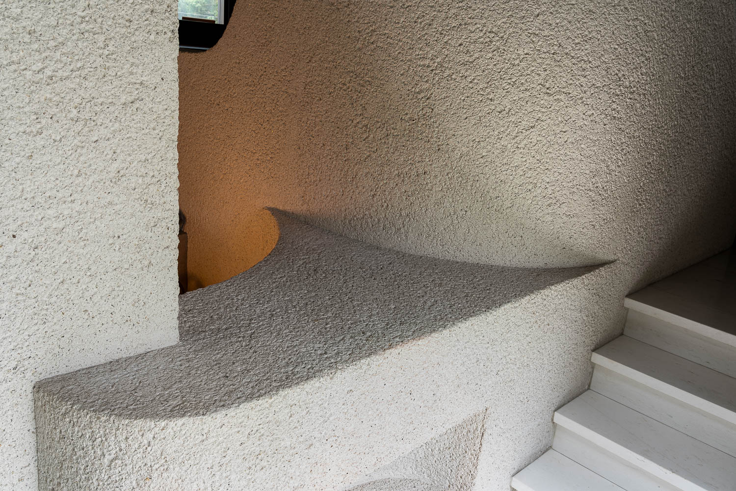 Alle wanden en constructieve elementen, zowel binnen als buiten, met uitzondering van de met mozaïektegels beklede ruimten, zijn afgewerkt met zogenaamde krabstuc pleisterwerk. Deze bijzondere sierpleister wordt in twee fasen gerealiseerd. Na het aanbrengen en het enkele dagen laten drogen van een dikke minerale pleisterlaag wordt deze ‘gekrabd’ met een speciale borstel waardoor een fraai natuurlijk uiterlijk ontstaat. De in wit marmer uitgevoerde plinten vormen een vlak met wanden en zijn niet zoals gebruikelijk voor de wanden geplaatst.