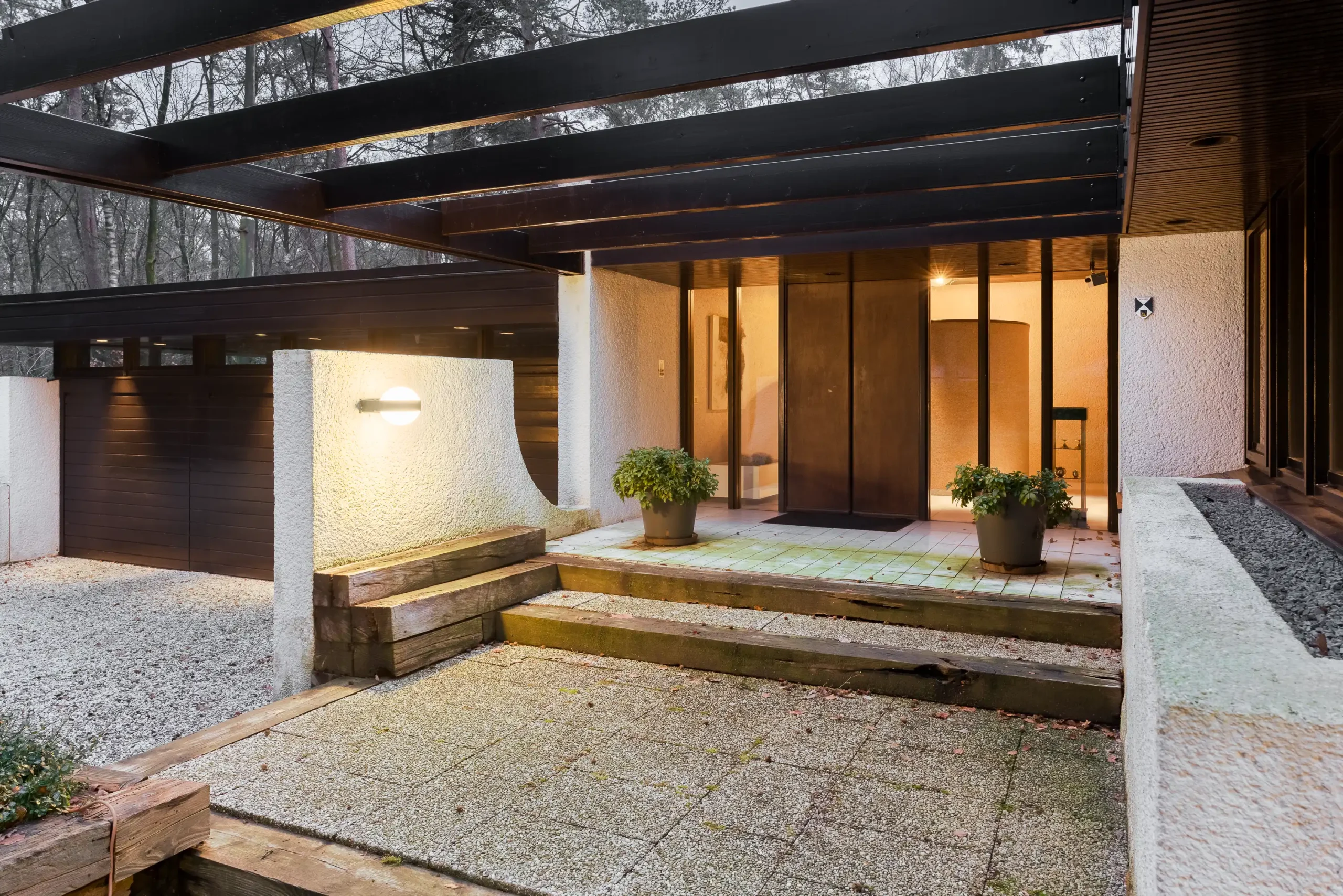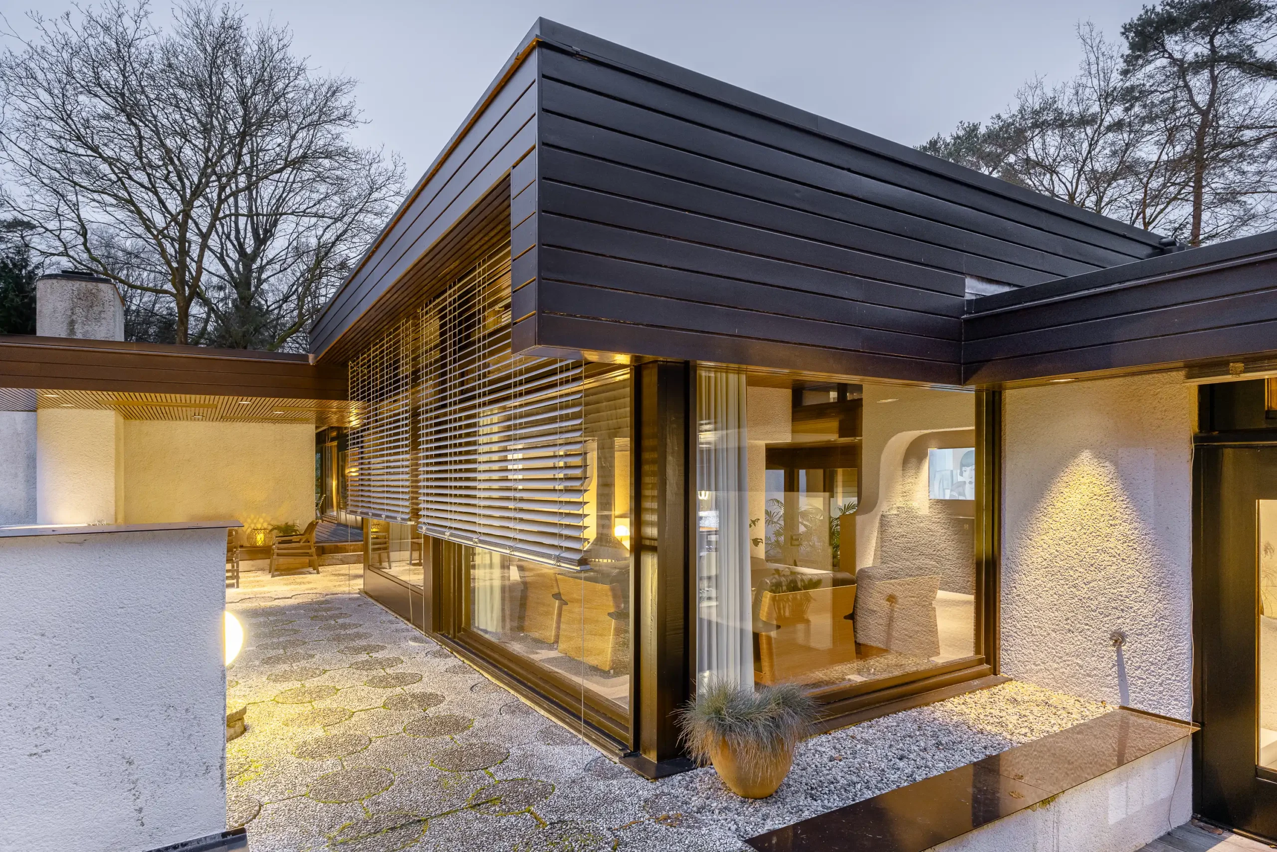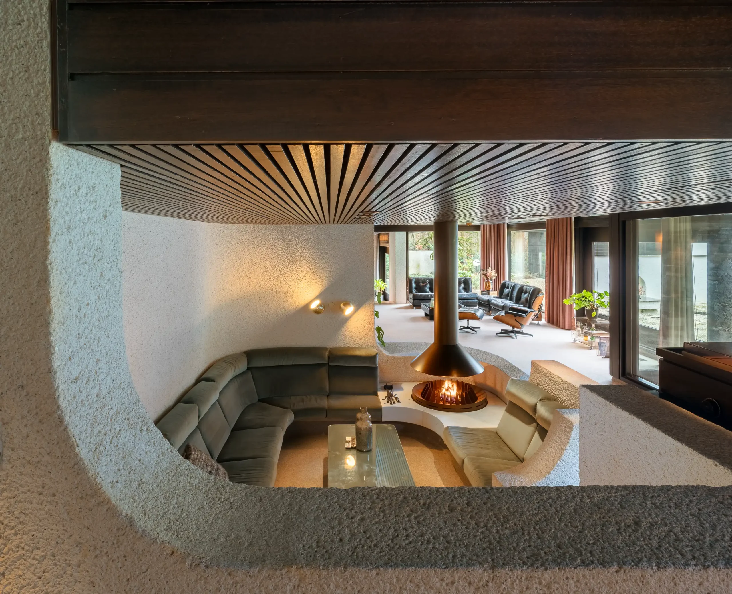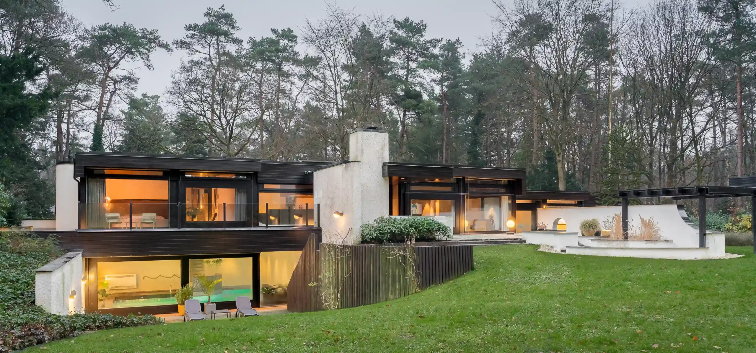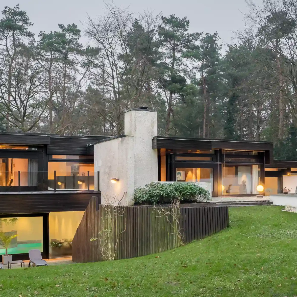 De opdrachtgever was de flamboyante tandarts Rinze Peter Siesling (1944- 2021). Hij liet hier in de jaren zeventig een huis bouwen dat aan de Côte d’Azur niet zou hebben misstaan. De grandeur is zichtbaar in de complexe plattegronden, de in elkaar overvloeiende ruimten met steeds weer nieuwe doorzichten op tuin en bos. Maar ook in de magistrale afwerking met bijzondere, uit Japan afkomstige mozaïektegels en de toepassing van de nieuwste technieken in het interieur. In die zin weerspiegelt het huis de glamour en stijl zoals we die kennen van huizen in de James Bondfilms en nodigt het uit tot entertainen.