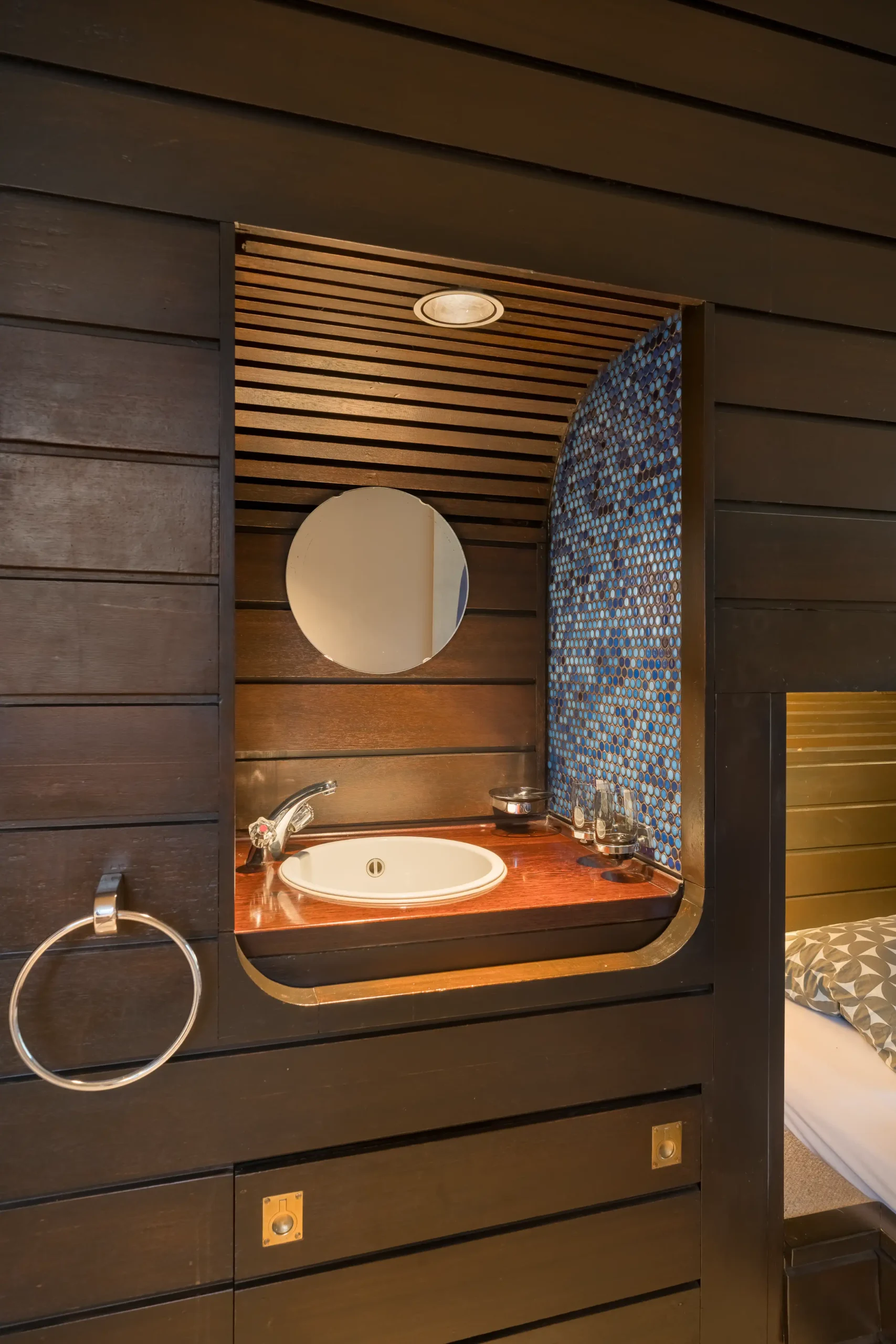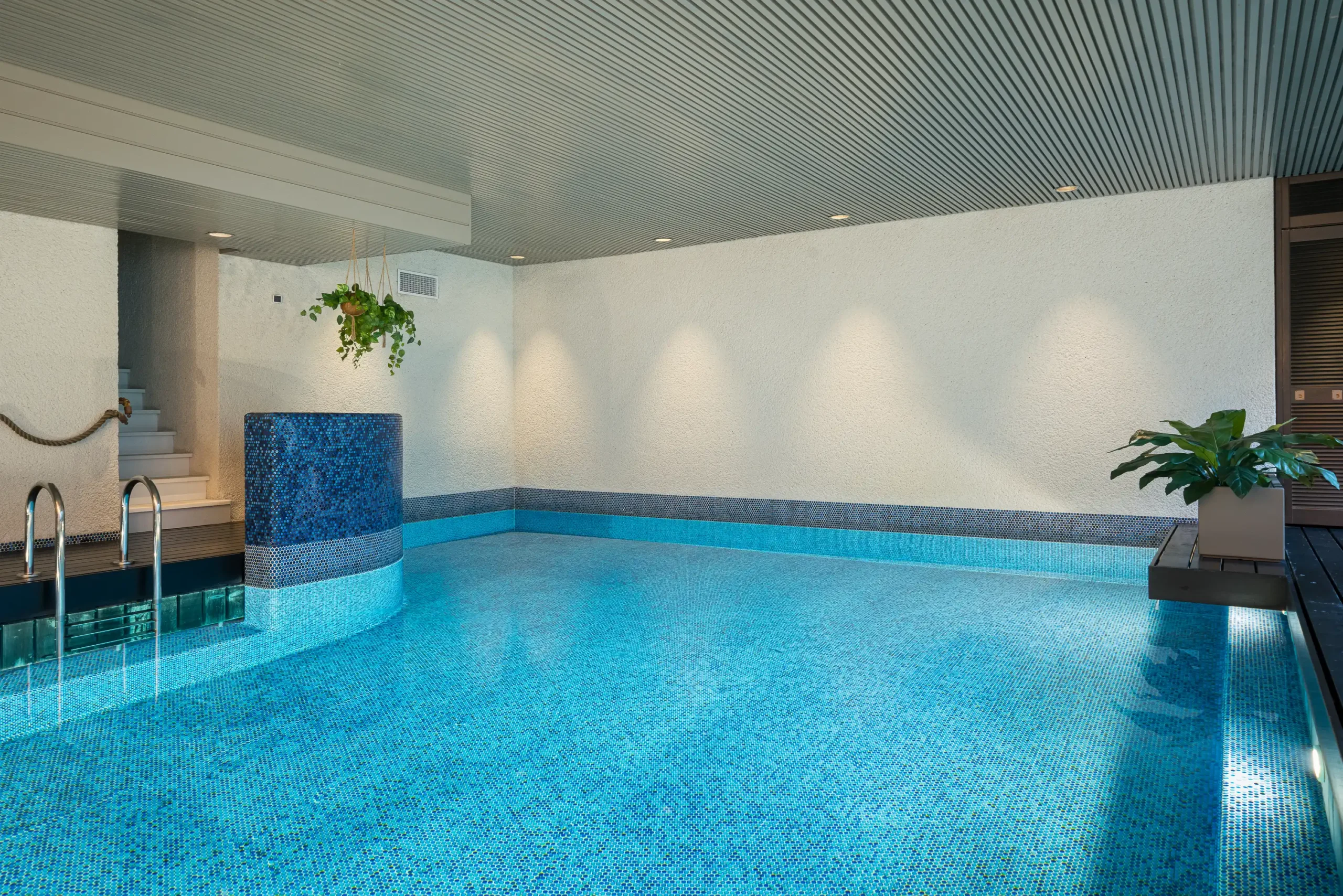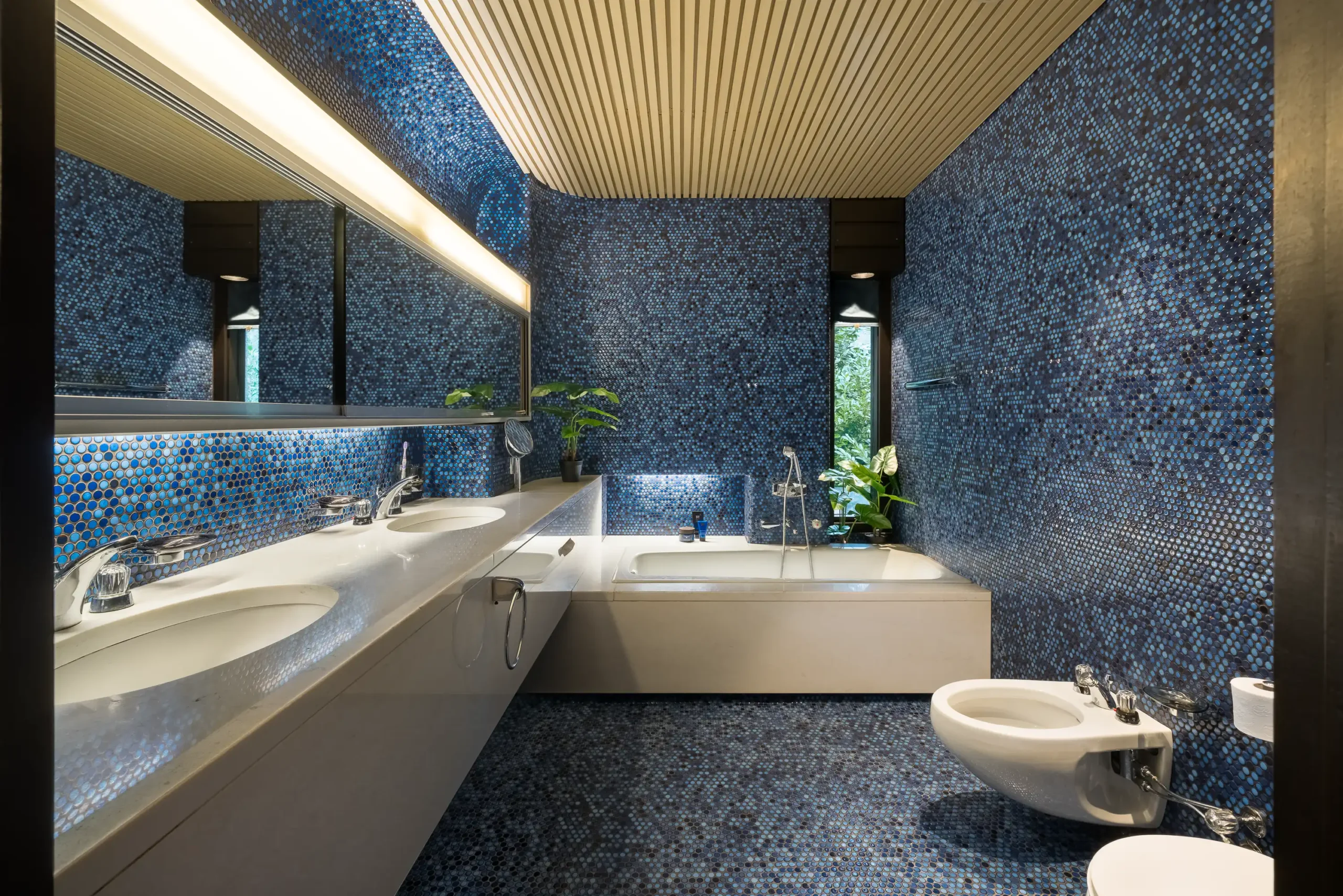 Bijzonder is dat in het huis zo goed als alle (vaste) interieurelementen nog authentiek zijn, zoals de kleine ronde, uit Japan afkomstige blauwe tegeltjes (mozaïek tegelmatjes), in de ‘natte’ ruimten waaronder de keuken, de badkamers, de wc’s en het zwembad. Deze laatste ruimten zijn bovendien nog voorzien van noviteiten als thermostaatkranen van het Duitse merk Grohe en sanitair van het Amerikaanse merk IDEAL STANDARD dat hangende toiletten en een bidet leverde.