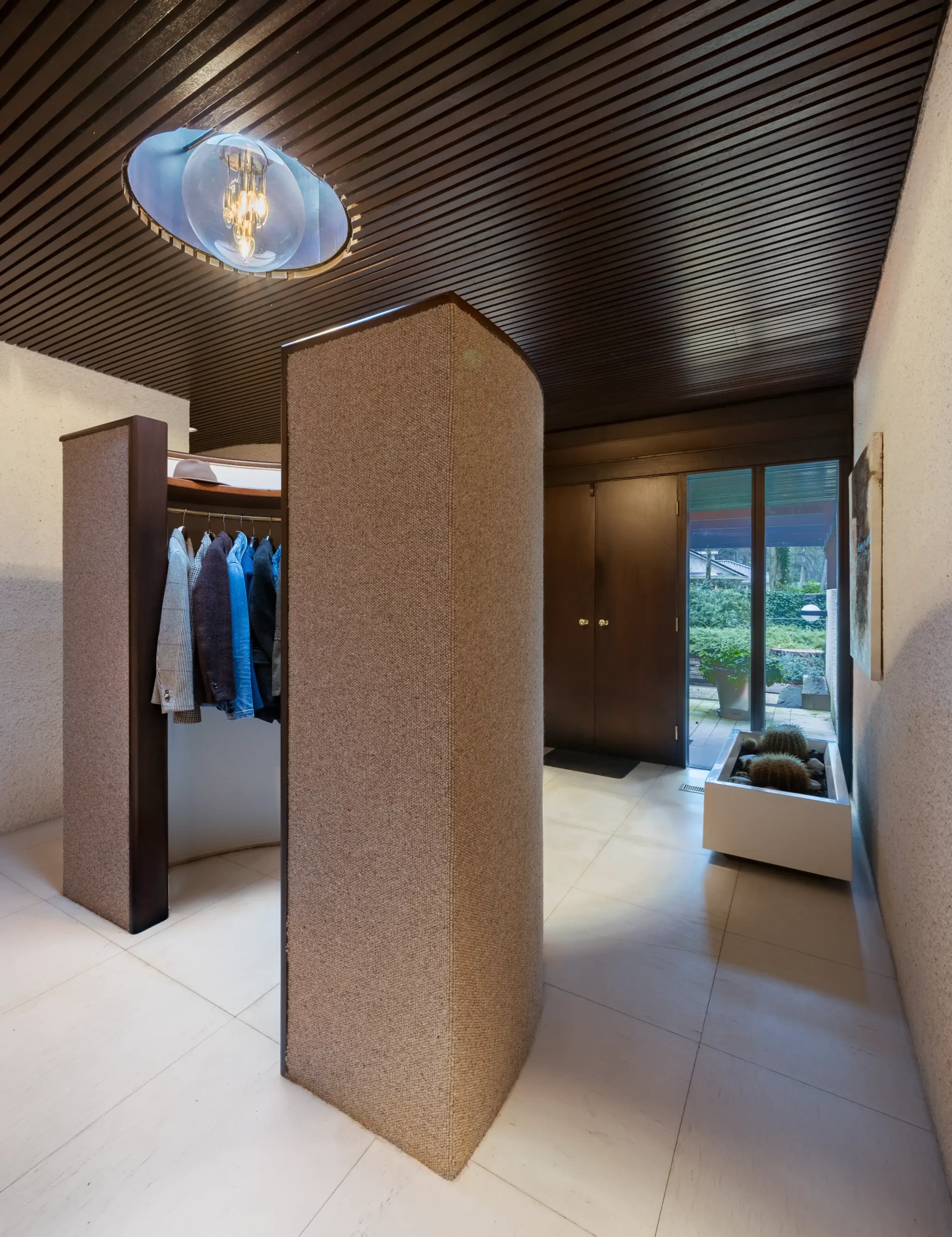 Het huis wordt gekenmerkt door kleinere en grotere hoogteverschillen tussen de verschillende ruimten. De ruimten in het huis zijn verschillend in grondvorm en ruimtewerking waardoor de beleving steeds verandert. Elementen uit het interieur komen terug in het exterieur waardoor de relatie tussen beiden wordt benadrukt. Zo zijn dezelfde karakteristieke ‘Space Age’ rondingen in de vorm van de cirkel, halve cirkel en de kwart cirkel zichtbaar in wanden in het interieur maar ook in de tuinmuren en is het kenmerkende pleisterwerk (krabstuc) overal terug te vinden. De relatie tussen binnen en buiten wordt versterkt door het samenspel van de woonkamer en de overdekte zithoek in de tuin, waar bijvoorbeeld dezelfde meranti latten aan het plafond bevestigd zijn. De tuin bevat onder andere een tweede, verdiepte, zitgelegenheid, barbecue en een inmiddels gedempte vijver zoals ontworpen in de jaren ’70 van de vorige eeuw.