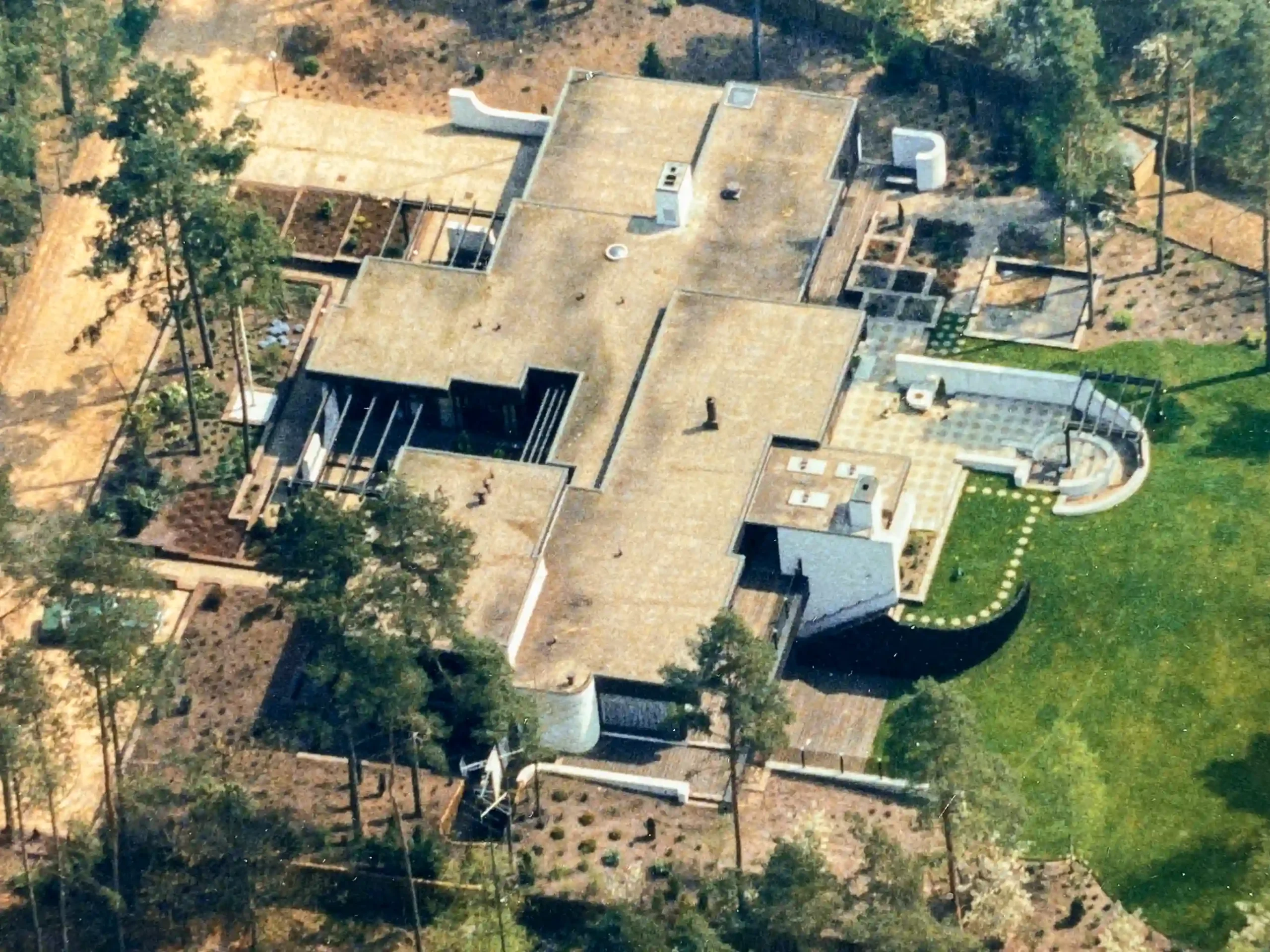 Het futuristische huis wordt gekenmerkt door een nagenoeg rechthoekige samengestelde opzet, met een aantal in- en uitspringende bouwdelen, platte van isolatieplaten voorziene daken en forse daklijsten. De via een trappartij te bereiken entree – tegelijk vestibule als garderobe – en de werkkamer van meneer zijn op het noorden gericht en hebben een besloten karakter. De kopse bouwdelen van het huis zijn onderkelderd. Aan de oostkant van het landhuis zijn de keuken, de bijkeuken, en de lager gelegen garage gesitueerd met daaronder de wijnkelder, doka en bergruimten. Aan de westzijde bevinden zich drie slaapvertrekken, drie badkamers, waarvan één in de kelder bij het zwembad, en een ‘atelierruimte’.